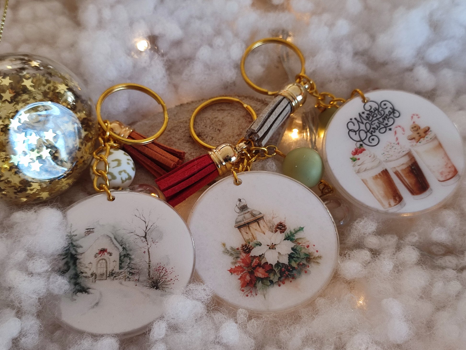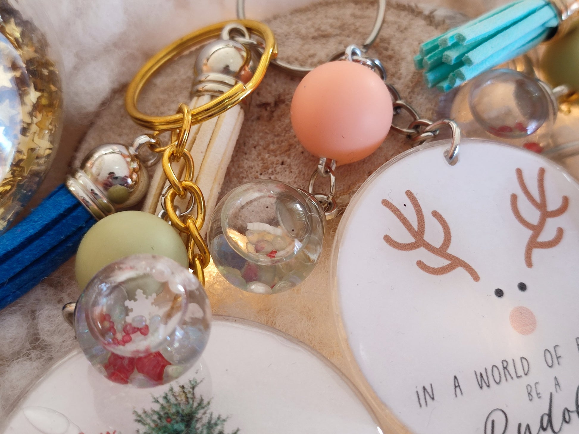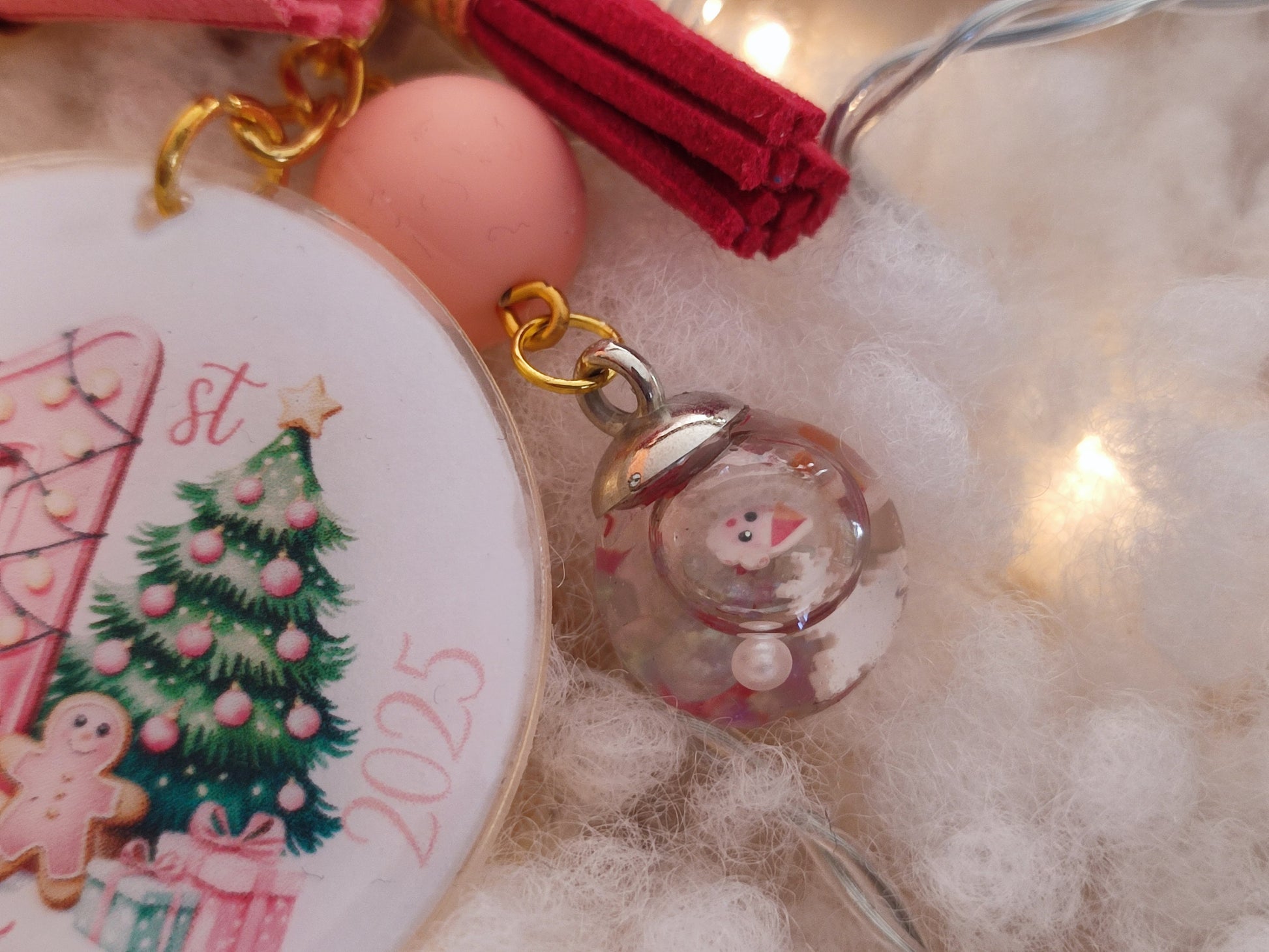 Porte-clés de Noël au charme rétro qui capture la magie des fêtes. Orné d'une breloque ronde et de délicates boules à neige, ce petit accessoire apporte une touche festive à vos clés au quotidien. Son design vintage intemporel en fait un cadeau parfait pour les amateurs de décoration nostalgique. Pratique et élégant, il transforme un objet du quotidien en véritable pièce de collection.